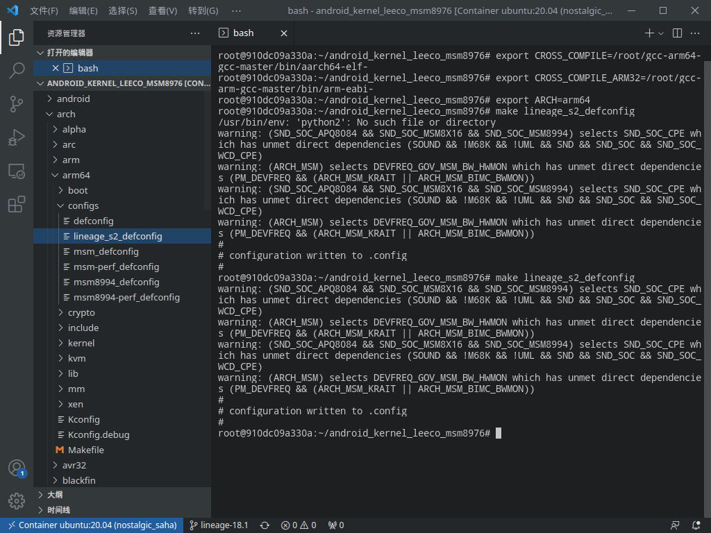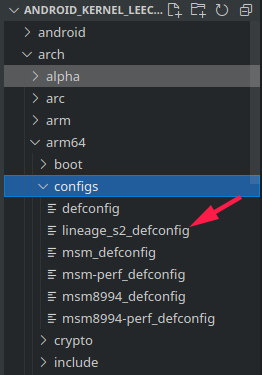 先展开arch/arm64/configs,然后可以看到我们要找的配置文件是lineage_s2_defconfig